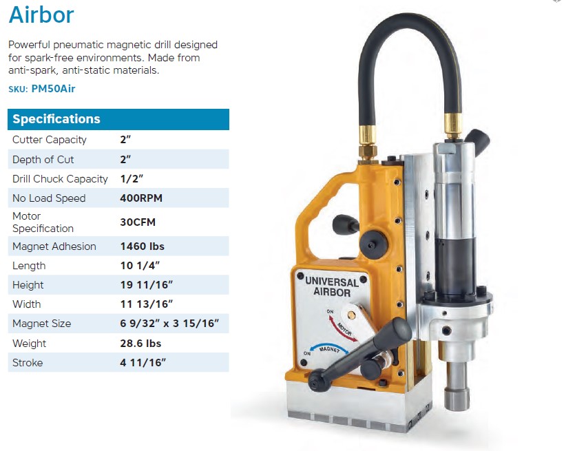 - Optimized for spark-free environments, the Airbor provides high-performance drilling from a pneumatic power supply.