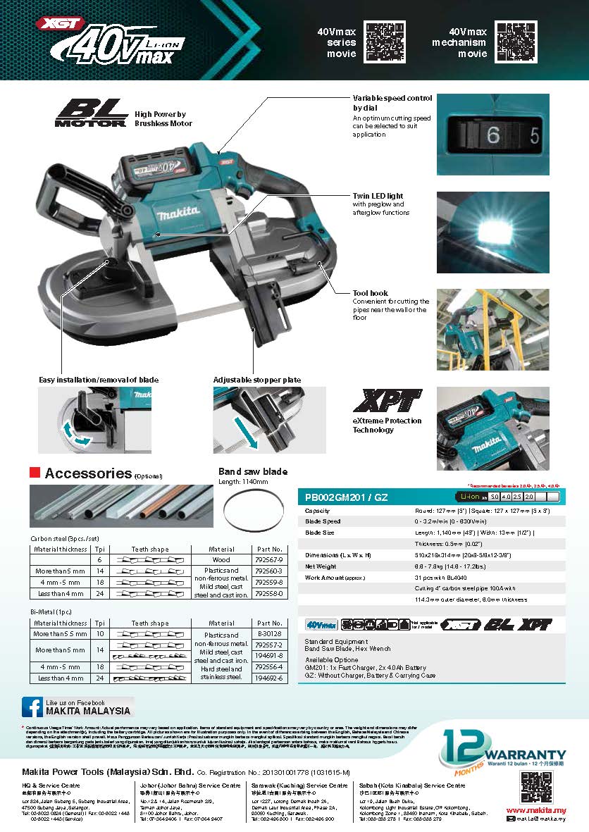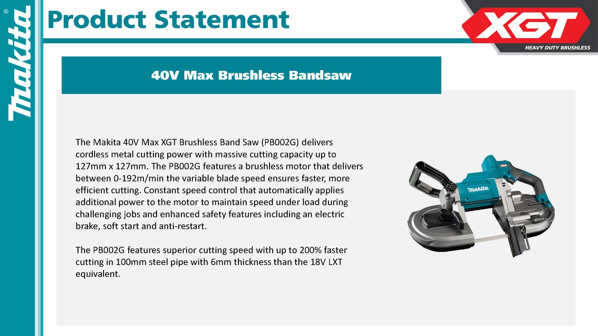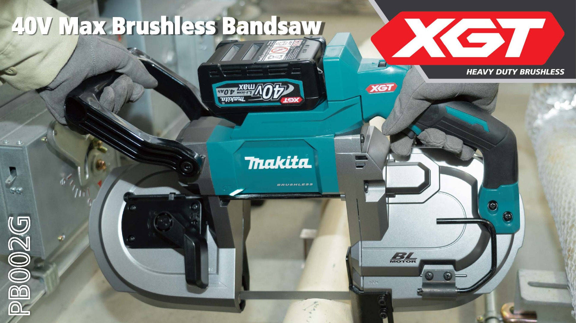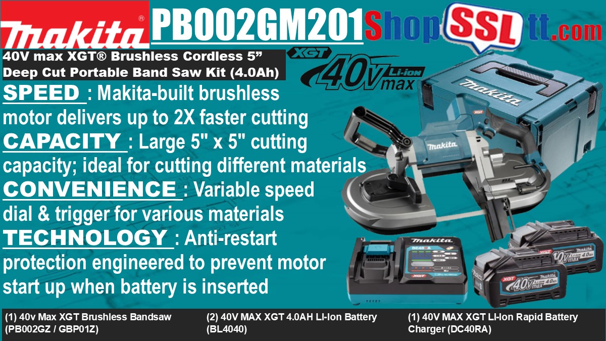 The 40V max XGT® Brushless Deep Cut Portable Band Saw (PB002GM201 / GBP01) delivers metal cutting performance without a cord. It features a Makita-built brushless motor that delivers faster cutting with a variable speed of 0-630 ft./min. It is ideal for electrical, HVAC, installation, metal building, metal fabrication, plumbing, and any pro contractor who requires a cordless portable band saw.