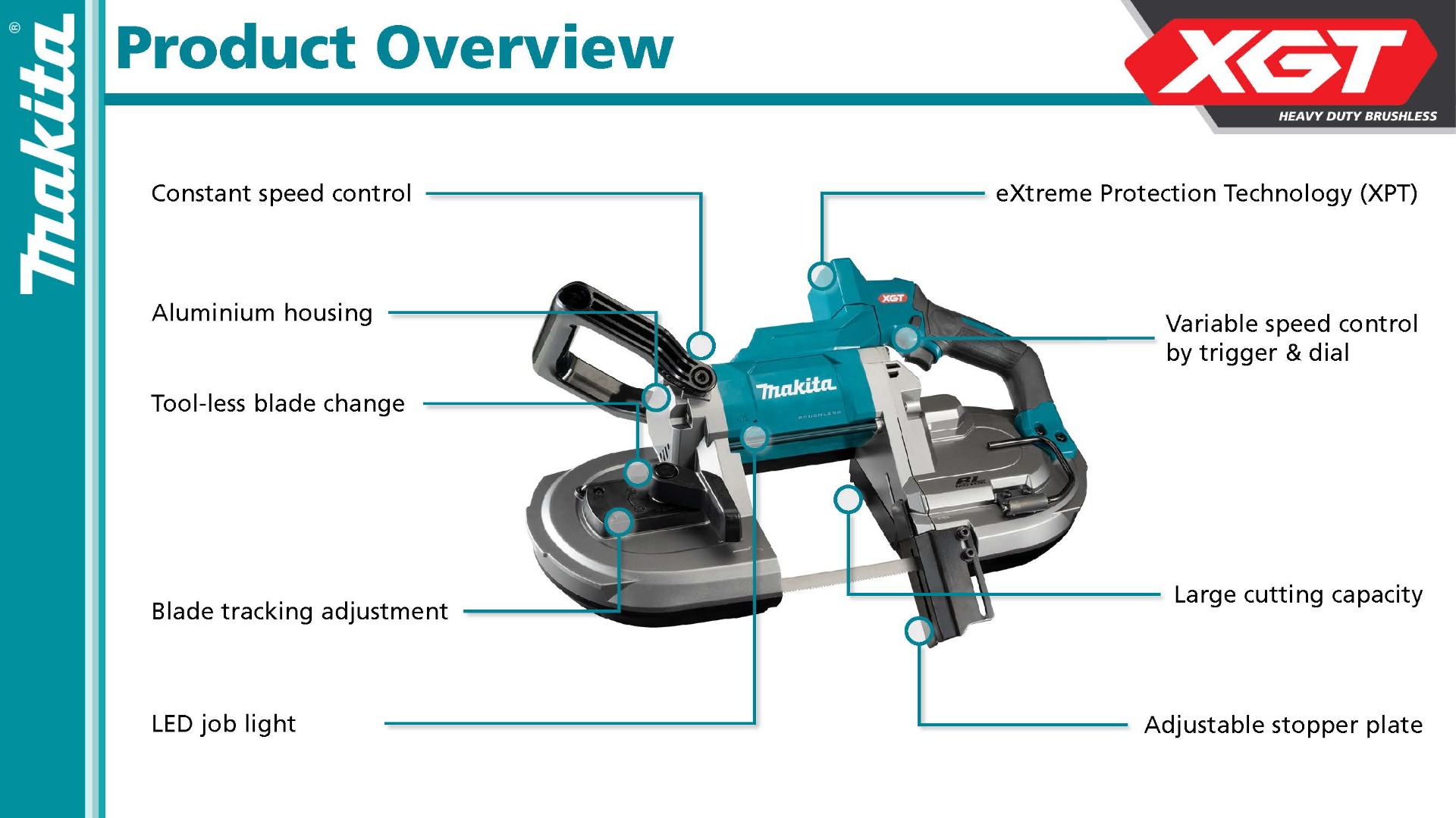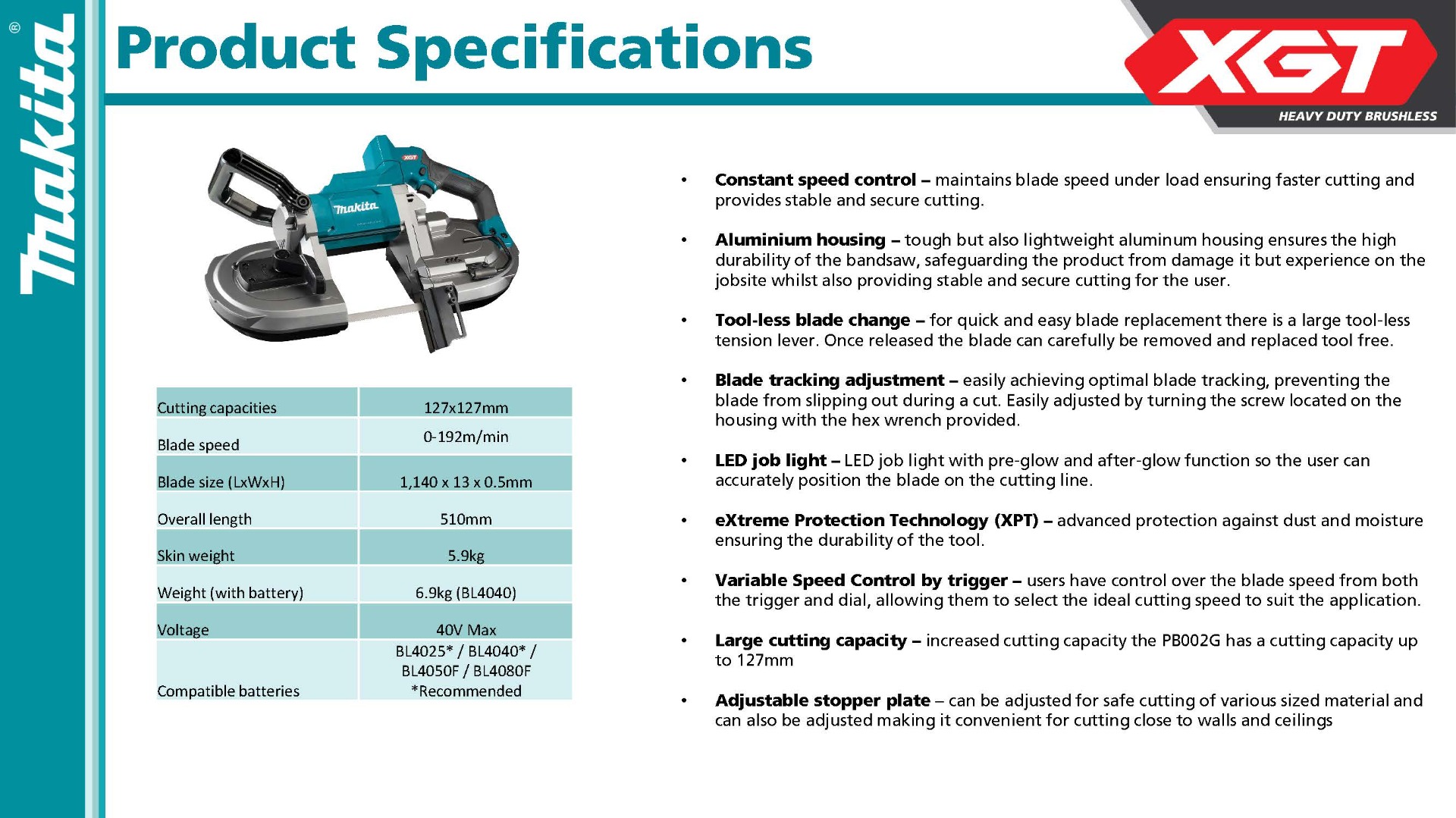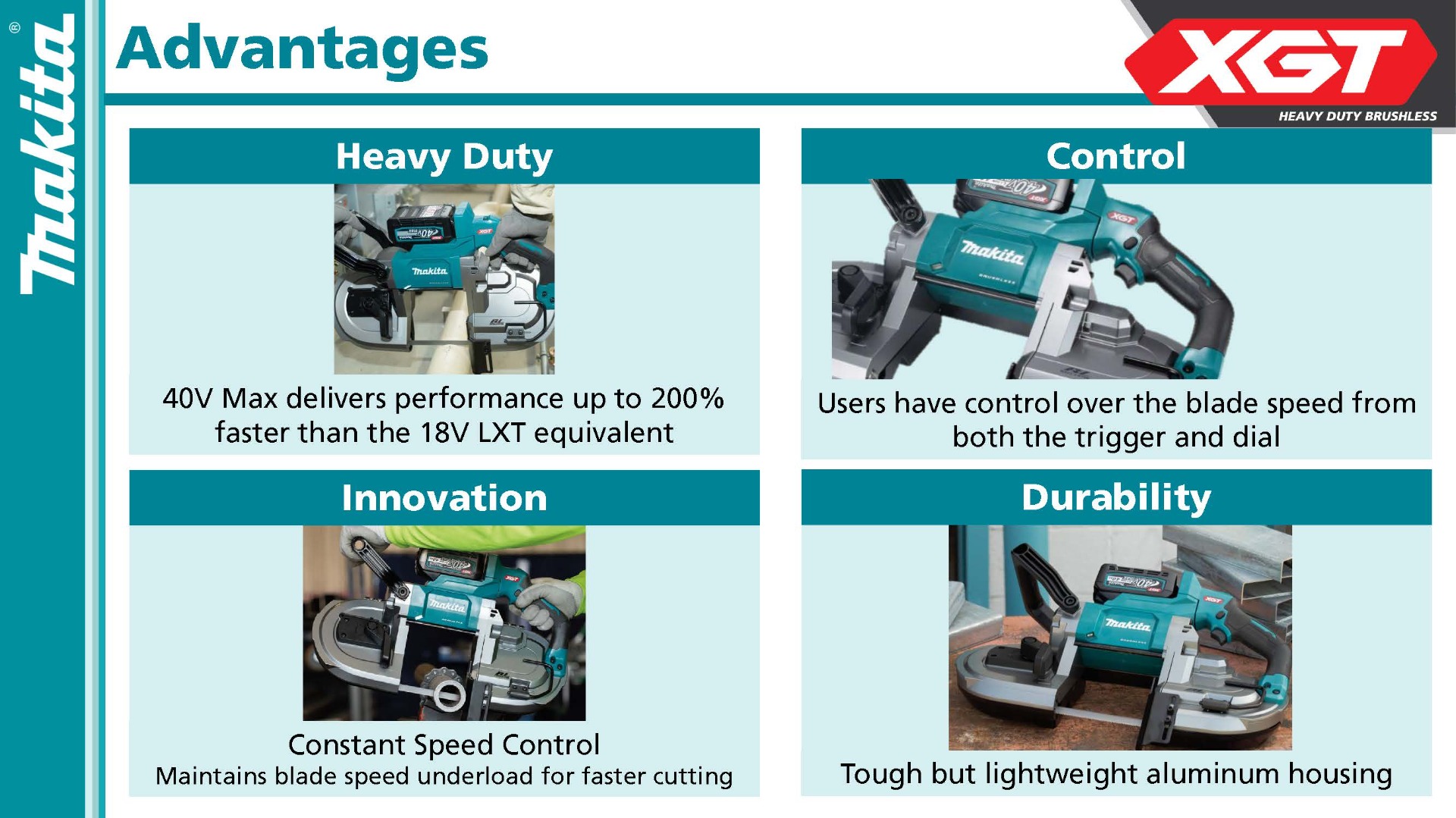 OUTPOWER: Makita-built brushless motor along with 40V max XGT® battery combine to deliver the cutting performance required for demanding applications
