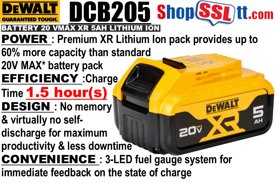 (1) DCB205 - 20V MAX* XR® High Capacity Li-Ion Batteries (5.0 Ah)