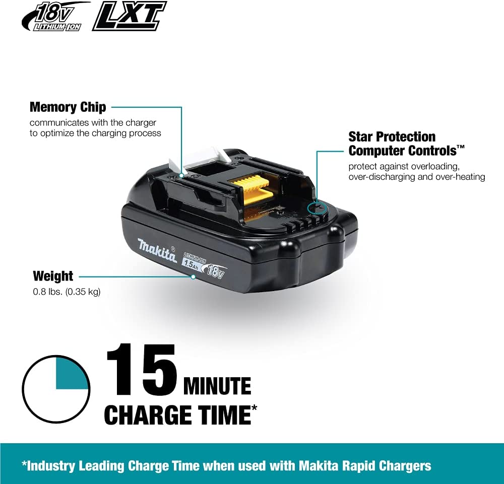 The Makita 18V LXT Lithium-Ion battery charges faster and works longer than standard lithium-ion batteries; giving you and your cordless tools unmatched performance and productivity to take on the most demanding applications. The Makita 1.5 Ah battery has a category-leading charge time of only 15 minutes; so it spends more time working and less time sitting on the charger. Makita 18V Lithium-Ion batteries resist self-discharge so they're ready for use even after long periods of storage. The Makita Rapid Optimum Charger (sold separately) is a smart-charging system that communicates with the battery during the charging process to monitor current; voltage and temperature. This advanced charging technology helps optimize battery life and deliver a faster charge. In addition; the Charger has a built-in fan to cool the battery for faster and more efficient charging; even in hot weather conditions. For improved tool performance and extended battery life; Makita created STAR Protection Computer Controls. STAR Protection is communication technology that allows the tool and battery to exchange data in real time and monitor conditions during use to protect against overloading; over-discharging and overheating. Makita; the innovation leader in cordless tool technology; has the worlds largest cordless tool line-up powered by an 18V lithium-ion slide-style battery.