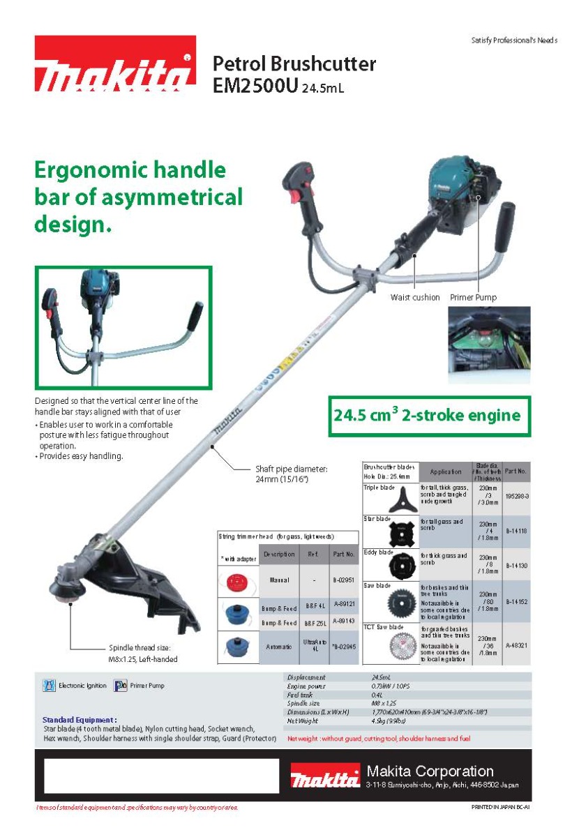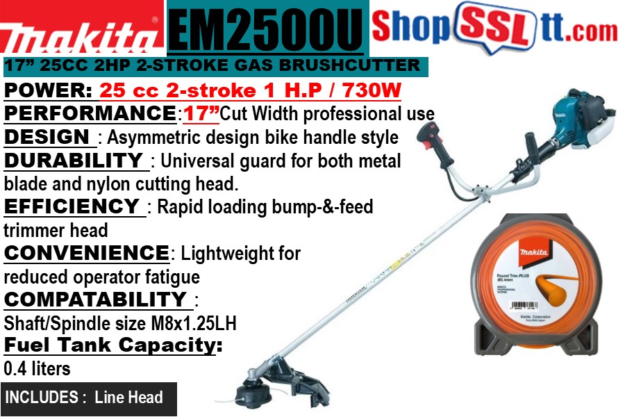 Makita 25ml Petrol Brush Cutter, EM2500U, features a powerful 745 W / 1 HP engine and four cutting modes that offer you the flexibility to tackle any trimming job, whether you are caring for your hedge or clearing unwanted undergrowth from mangroves and forests. The product is of lightweight and low in vibration for greater comfort, it has an ergonomic handle design with a soft start to reduce kickback when starting the blade, as well as a gear ratio allowing this machine to cut through tough branches up to 0.5" in diameter. It works well when you have to prune trees without damaging bark or foliage. The Petrol Brush Cutter is available in the dimension of : 1,770x620x410mm (69-3/4"x24-3/8"x16-1/8").