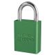 The American Lock No. A1105KAGRN Aluminum Padlock, Keyed Alike – multiple locks open with the same key – features a 1-1/2in (38mm) wide green anodized aluminum body with a 1in (25mm) tall, 1/4in (6mm) diameter chrome plated, boron alloy shackle for superior cut resistance. The anodized finish makes padlock suitable for lockout in food processing facilities and corrosion resistant finish ideal for tough environments.