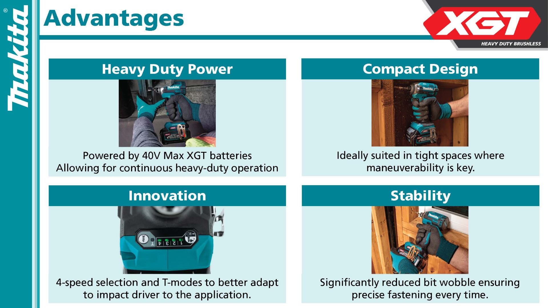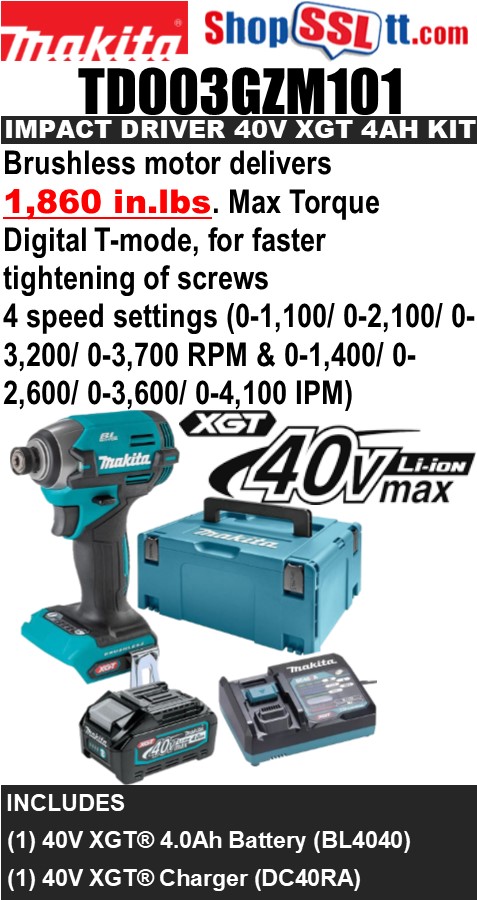 The 40V max XGT® Brushless Cordless 4-Speed Impact Driver (TD003GZ/ GDT02D) breaks new ground for the most demanding driving applications in wood, masonry and metal. The 4-Speed Impact Driver features a digitally controlled Tightening Mode (T-mode) for faster tightening of self-drilling screws which helps prevent damage to the screw or workpiece.