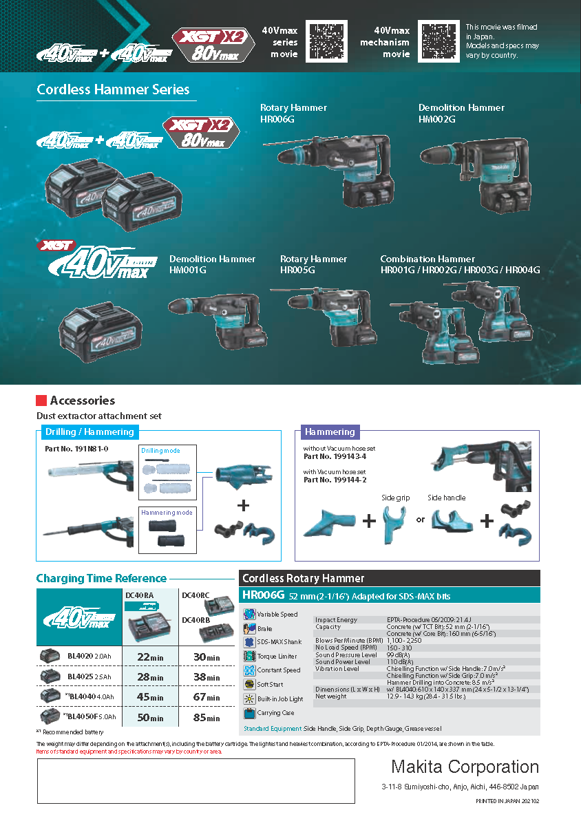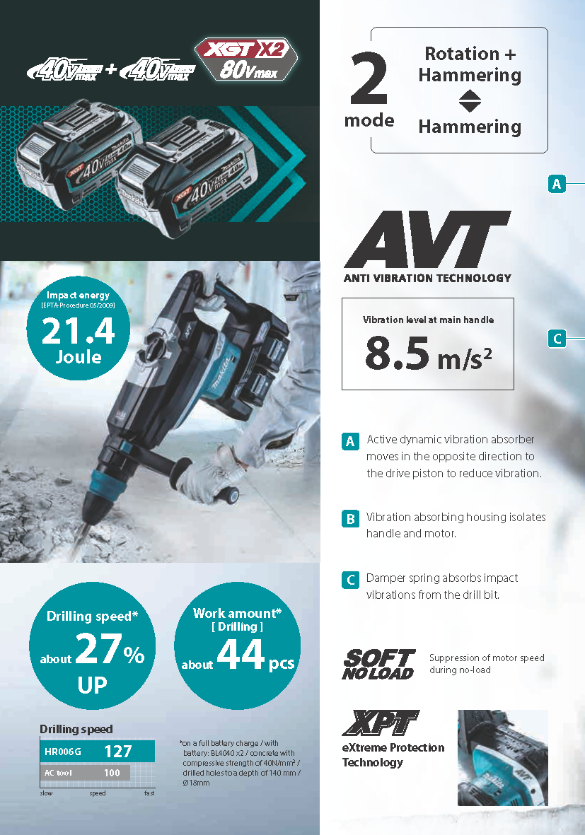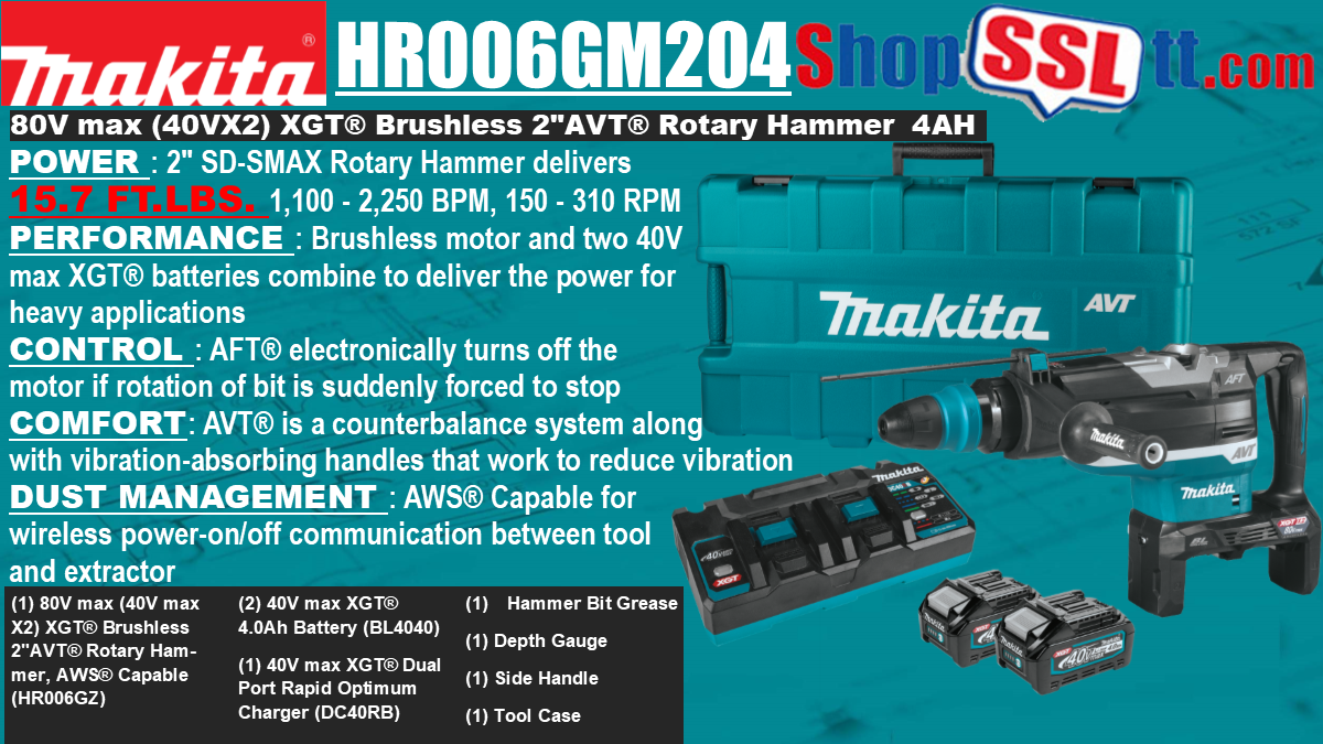 The 80V max (40V max X2) XGT® Brushless 2” AVT® Rotary Hammer Kit (HR006GM204/ GRH06PM) is a cordless concrete solution designed for heavy-load applications. It delivers the power, speed, and run-time for corded demands, without the cord.