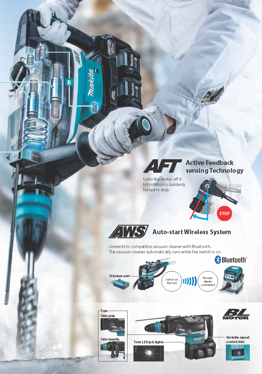 The Rotary Hammer has dust extraction capability with an optional Makita® Dust Attachment Kit (sold separately). For added efficiency, the HR006GM204/ GRH06PM is equipped with Auto-Start Wireless System (AWS®), which uses Bluetooth® technology for wireless power-on and power-off communication between the equipped tool and dust extractor (sold separately). Once connected via AWS, the AWS-equipped dust extractor will automatically power on or off when the AWS-equipped cordless tool starts or stops, running only when the tool is in use. This increases productivity on a single charge and reduces continuous noise at the job or work site.