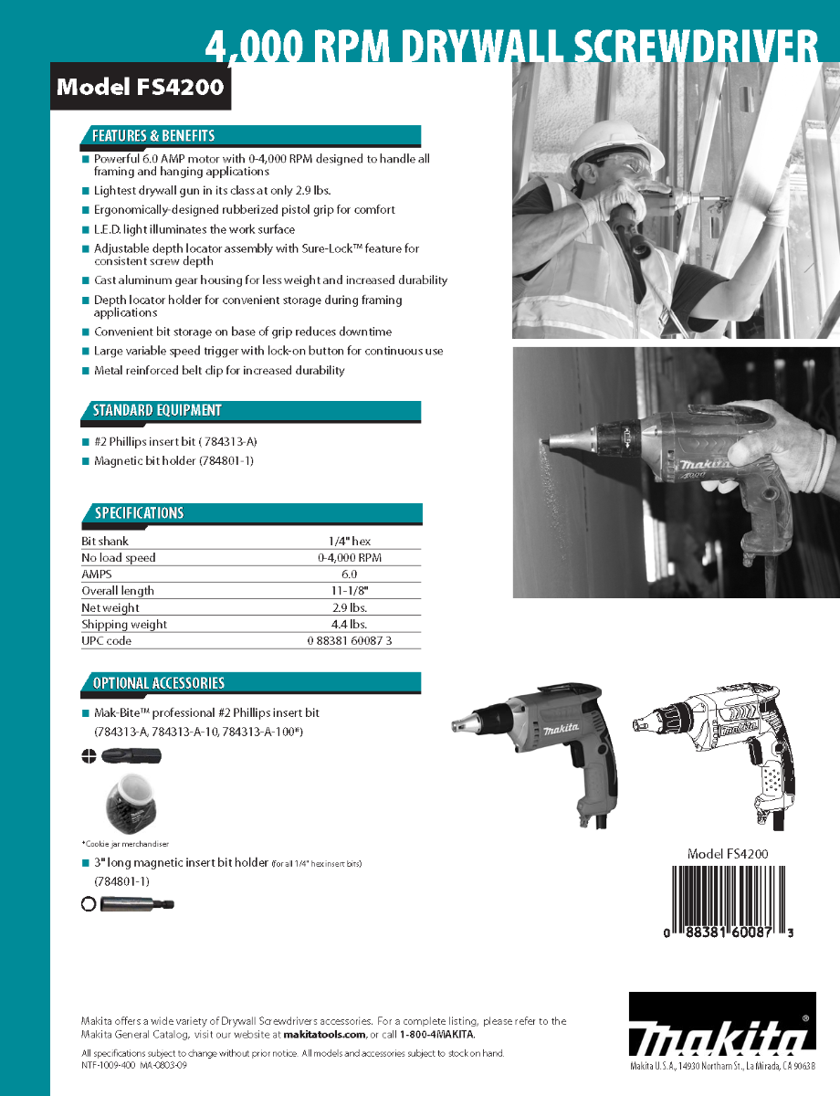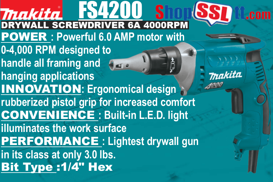 The Makita 4,000 RPM Drywall Screwdriver (model FS4200) delivers speed, power and ergonomics for drywall applications. It is ideal for driving drywall screws into steel studs.