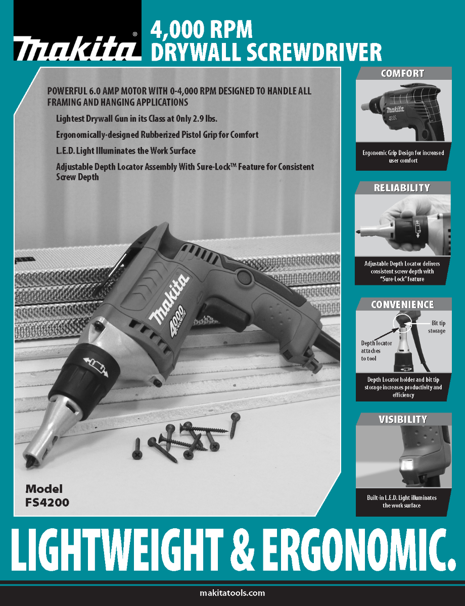 The FS4200 is powered by a 6 AMP motor that delivers 0-4,000 RPM and includes a large variable speed trigger with lock-on button for continuous use. The adjustable depth locator assembly with Makita’s Sure-Lock™ feature is engineered for consistent screw depth.