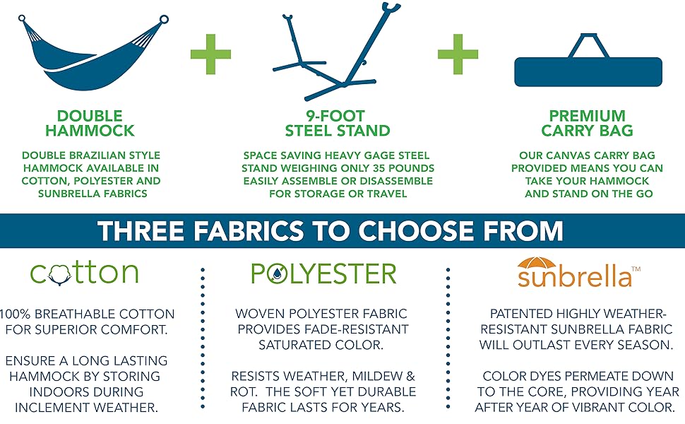 - Vivere combo, the double hammock with stand and carry bag is our top choice for combos. The double hammock is tightly woven with high quality cotton thread resulting in a heavy, durable fabric.
