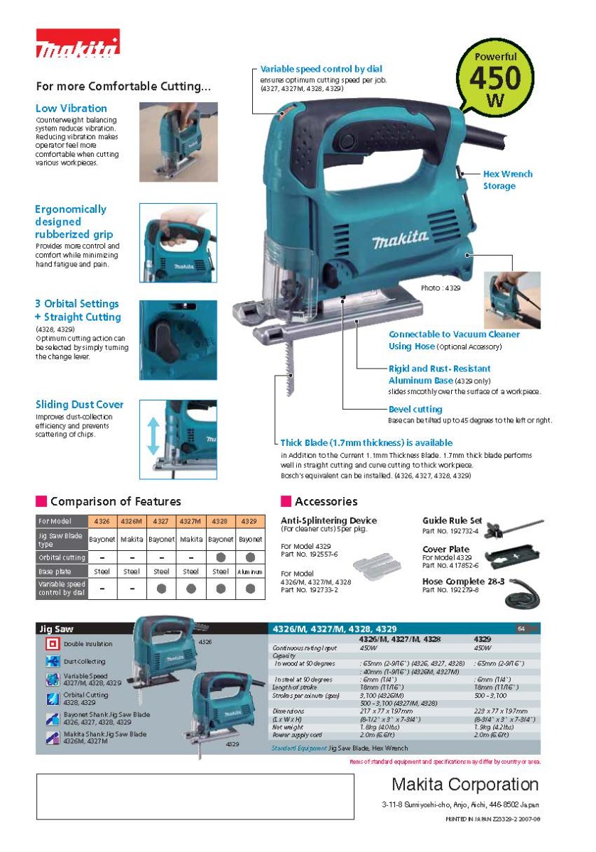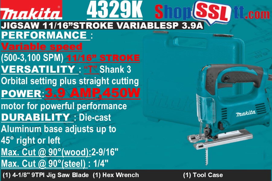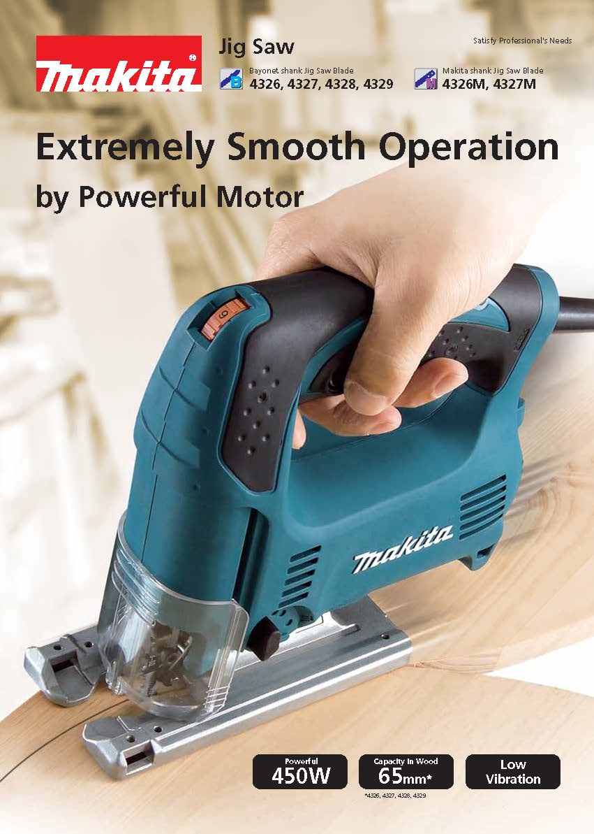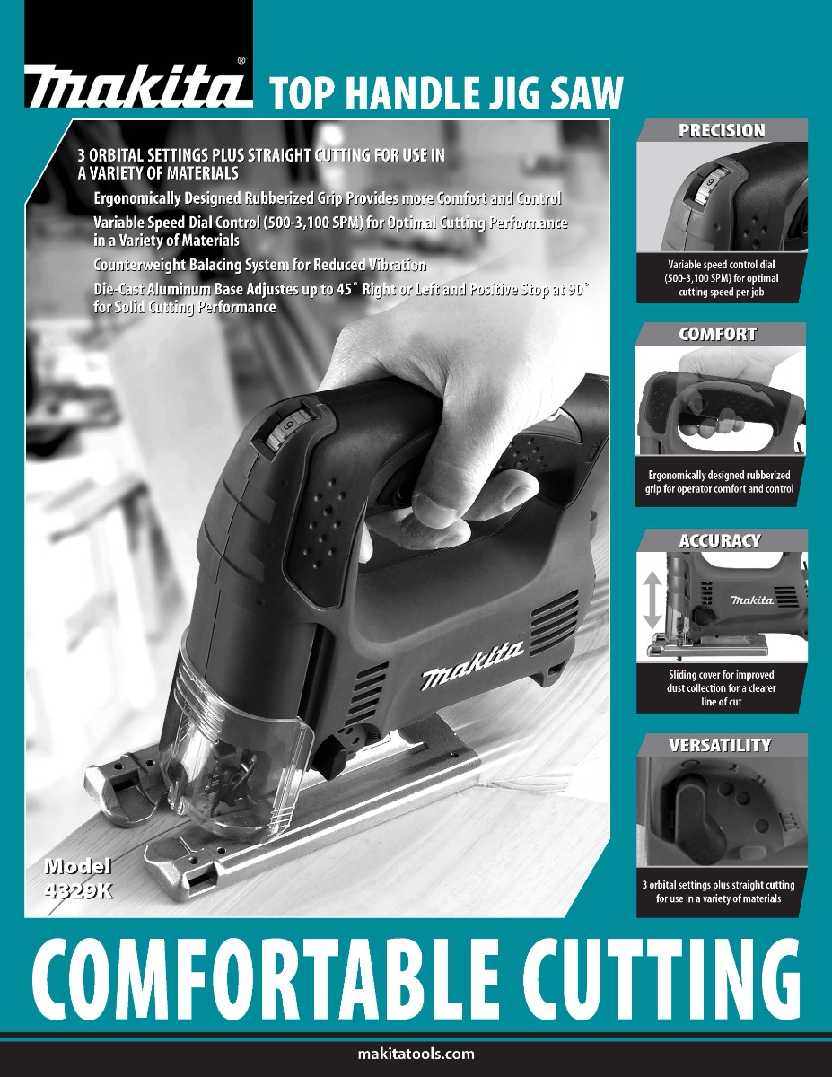The Makita Top Handle Jig Saw (model 4329K) combines power with a compact design and ease-of-use features for a range of cutting applications.