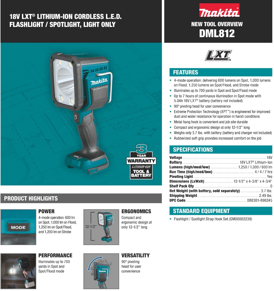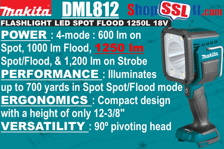 The Makita® 18V LXT® L.E.D. Flashlight/Spotlight (DML812) delivers bright illumination, versatility, and convenience. The flashlight has 4 modes of operation: Spotlight, delivering 600 lumens, Floodlight, delivering 1000 lumens, Spot/Flood delivering 1250 lumens, and Strobe.