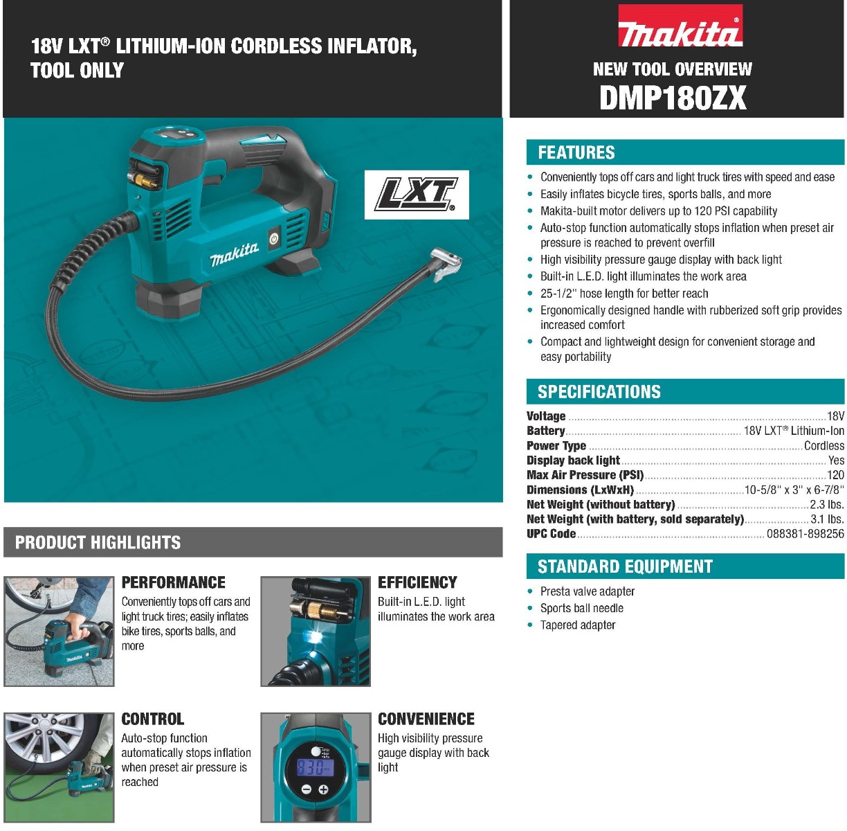 Inflate car tires, bike tires, or sports balls quickly with the 18V LXT® Cordless Inflator. The Makita-built motor delivers up to 120 PSI. The tool features a high visibility pressure gauge display with backlight, LED light, and an auto-stop function when the desired pressure is reached. A 25-1/2” hose length provides better reach. The compact design allows for easy portability and convenient storage.