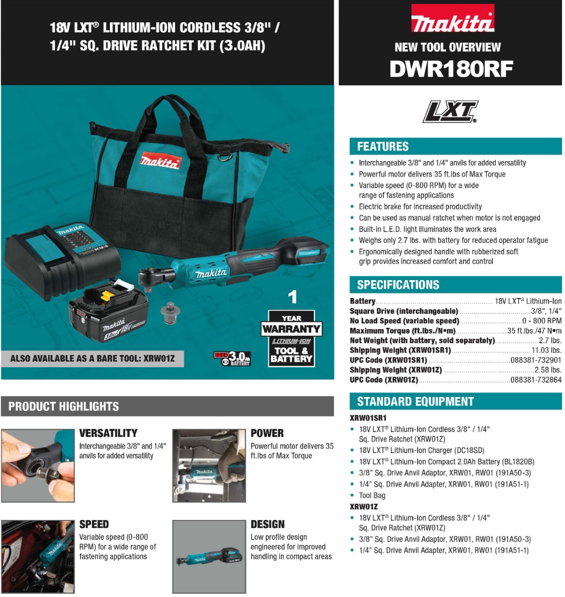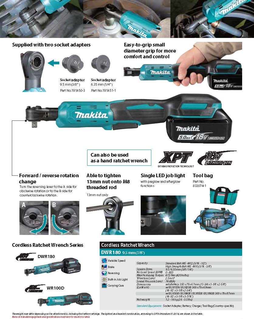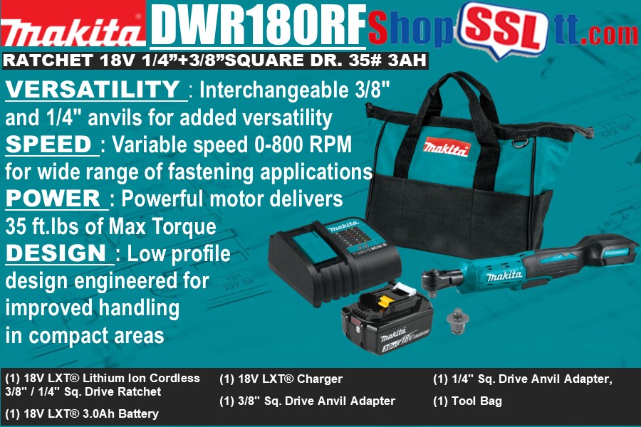 DWR180RF 18V LXT® Lithium Ion Cordless 3/8" / 1/4" Sq. Drive Ratchet