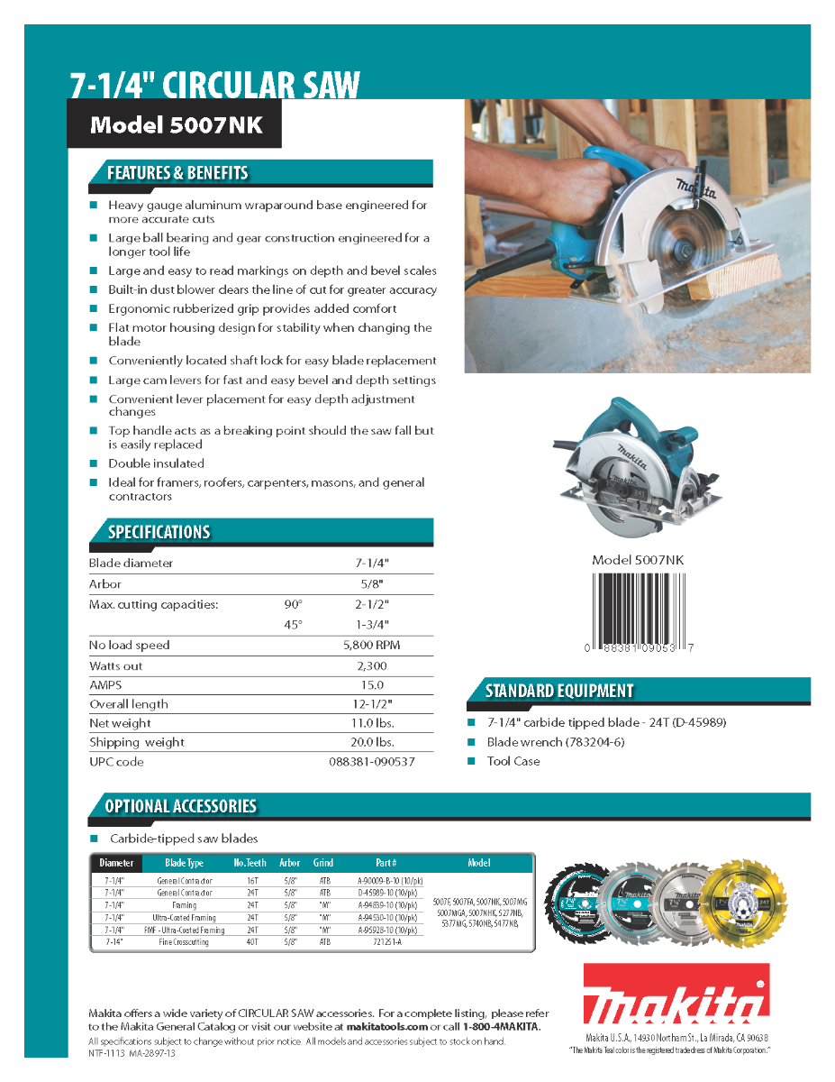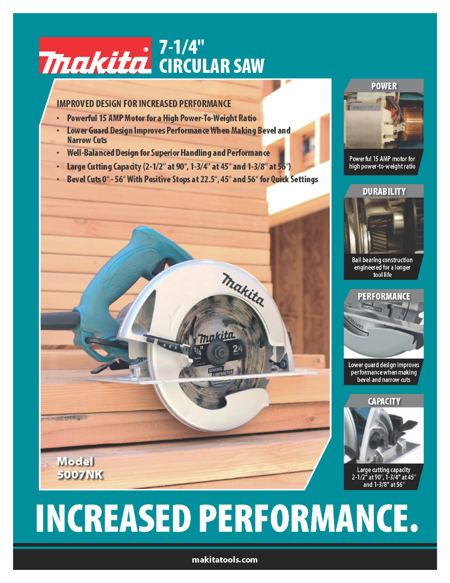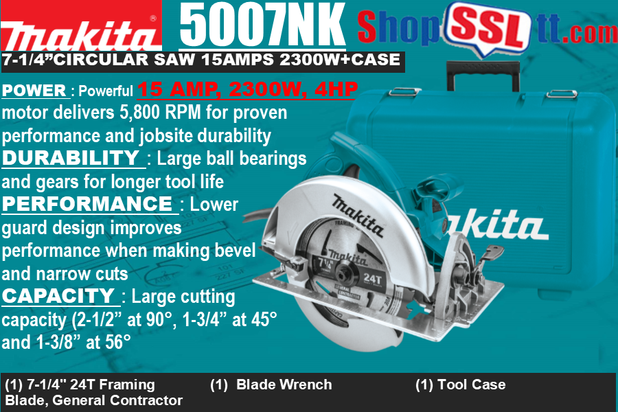 Makita listened to the pro-user and engineered the 5007NK 7-1/4- Inch Circular Saw with user-friendly features combined with power, weight, balance, and jobsite durability.