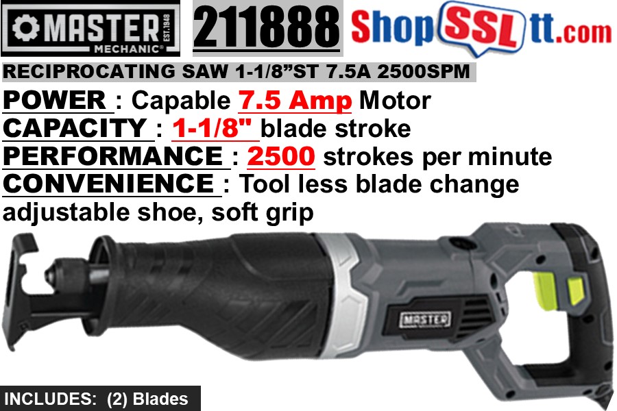 Master Mechanic, 7.5A, Reciprocating Saw, 0-2500 Strokes Per Minute, Tool Less Blade Change, Adjustable Shoe, Soft Grip, 1-1/8" Blade Stroke, Includes: 2 Blades.